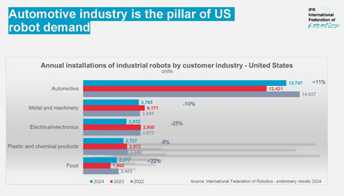 2025年5月8日,國際機器人協(xié)會(IFR)發(fā)布報告指出,美國汽車制造商加大了對自動化的投資:汽車行業(yè)工業(yè)機器人的總安裝量增長了10.7%,到2024年將達到1.37萬臺。