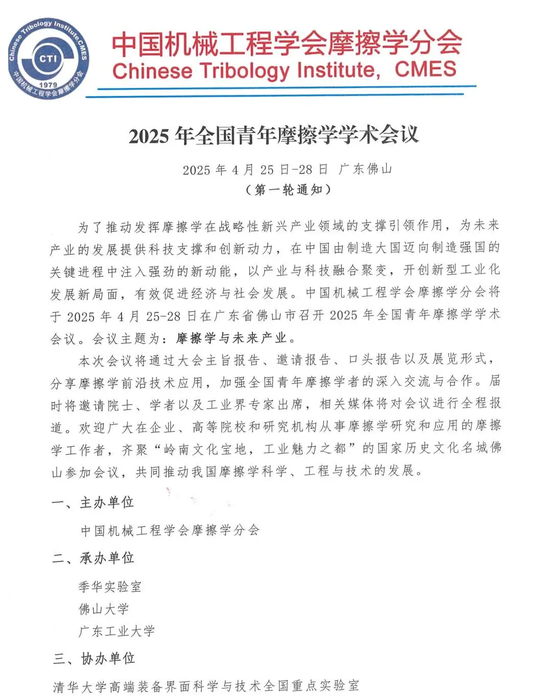 2025年全國(guó)青年摩擦學(xué)學(xué)術(shù)會(huì)議(第一輪通知)